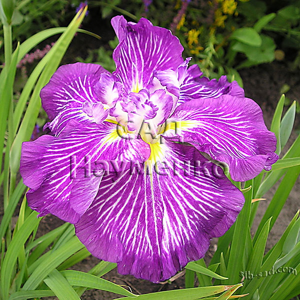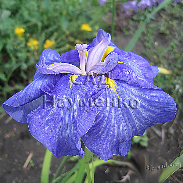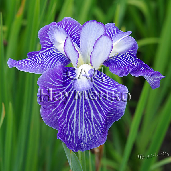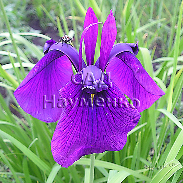 Ниже представлены в качестве примеров две серии фотографий некоторых цветущих японских ирисов (из нашей коллекции), все фото сделаны в разные годы в нашем саду. На первой фотографии приведен Ирис мечевидный (Iris ensata), родоначальник японских ирисов, привезенный нами с Дальнего Востока. Этот вид прекрасно себя чувствует, регулярно цветет и зимует без укрытия в условиях Новосибирска.