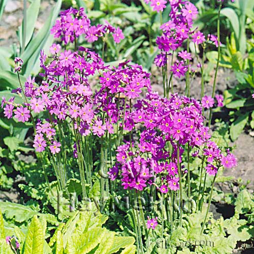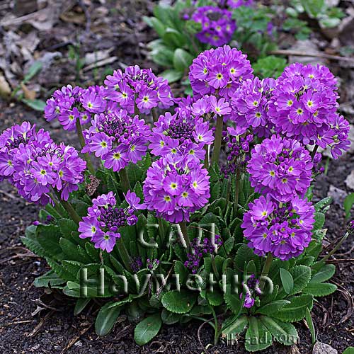 Высокая примула (до 40 см), цветет длительное время в мае яркими розово-сиреневыми цветками, собранными в идеальные шарики-соцветия на высоких и прочных цветоносах.