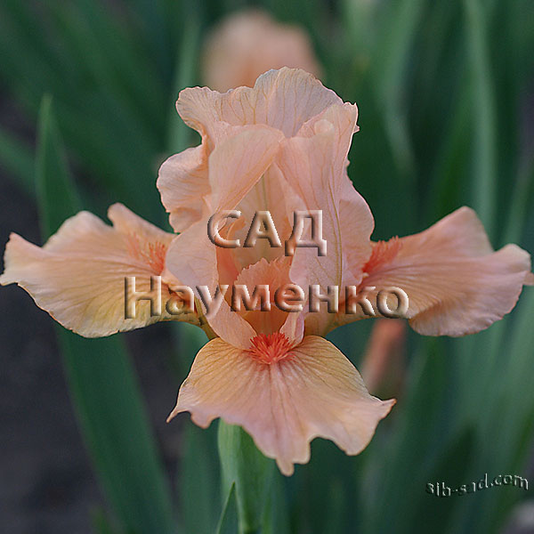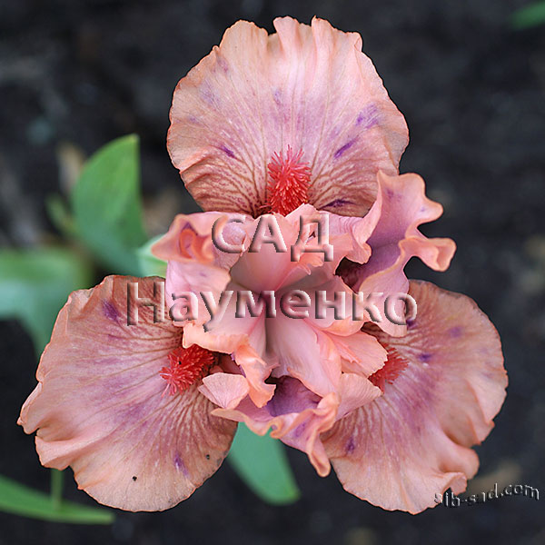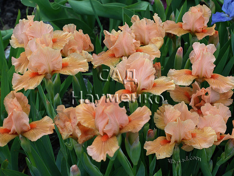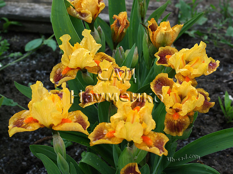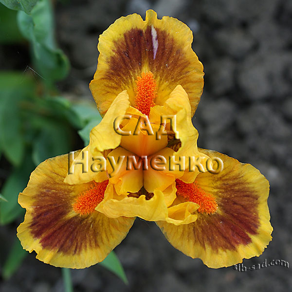Золотисто-абрикосовые Ст., Ф. еще темнее с красно-коричневым штриховатым пятном, бородка красная, крупная. Выдающийся по цвету!