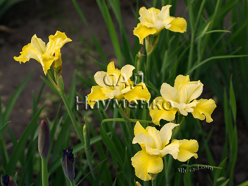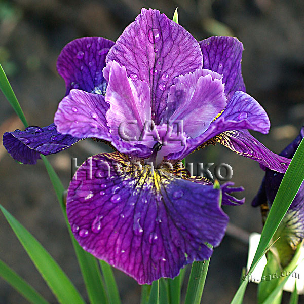 Ст. фиолетово-синие; Ф. сине-фиолетовые с темными прожилками и большим пятном в основаниях от золотистой в центре до кремовой к краю окраски и темно-фиолетовыми прожилками. Слегка гофрирован. Самый высокий в коллекции. Высота, см: 86 (126).* Срок цветения
