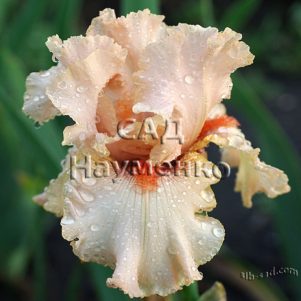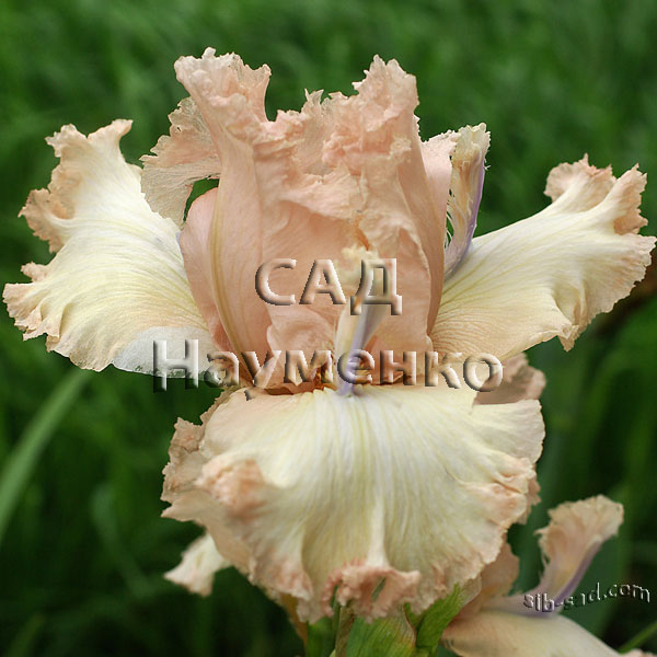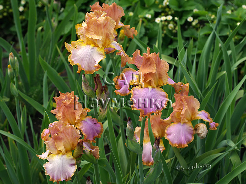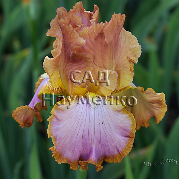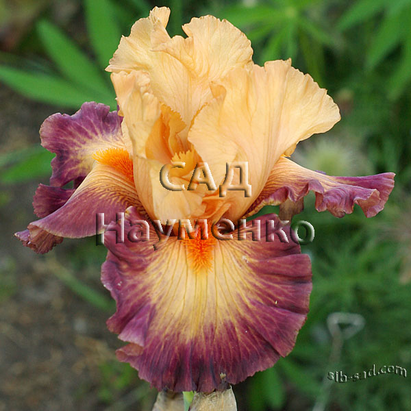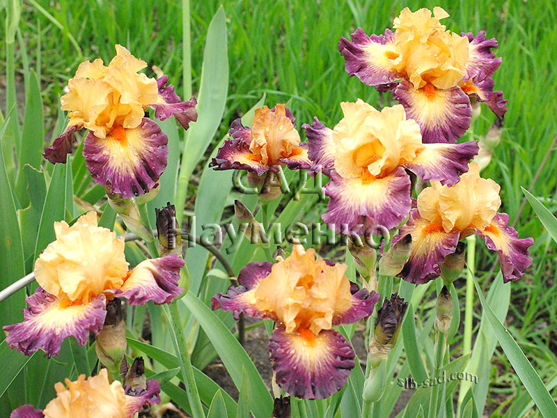 Ст. – оранжевые. Ф. – у бородок большое вишневое пятно, переходящее в оранжевое поле с вишневым жилкованием. Б. – абрикосово – ороанжевые с бледно – абрикосовым кончиком, основа светло - сиреневая. Гофрированный, парящий.