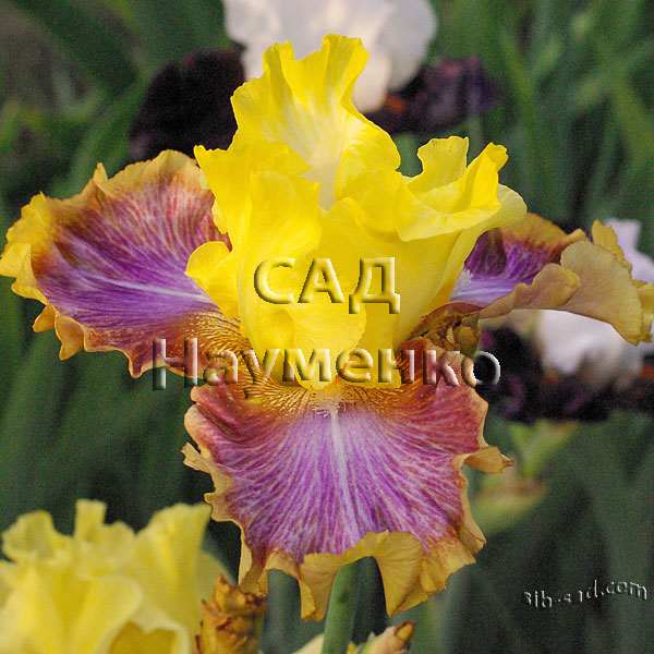 Ст. – жёлто-мимозные; Ф. – фиолетовые с двойной серо-красной лтой каймой; Б. – жёлтые. Высота, см: 89. Срок цветения: СП. Награды: HM: 2017.