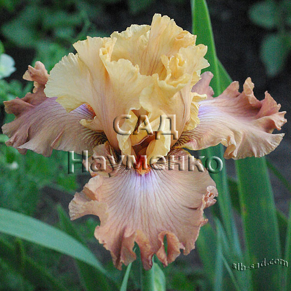 Жёлтые Ст. и красно-фиолетовые Ф. с большим белым пятном под оранжевыми Б. и серовато-оранжевой каймой. Высота, см: 91. Срок цветения: Р-П. Награды: HM: 2018.