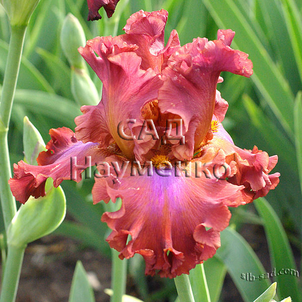 Ст. – бронзово-красные. Ф. – красные с фиолетовым центром и бронзовыми плечами. Б. – золотистые. Высота, см: 91. Срок цветения: С. Награды: HM: 2014.